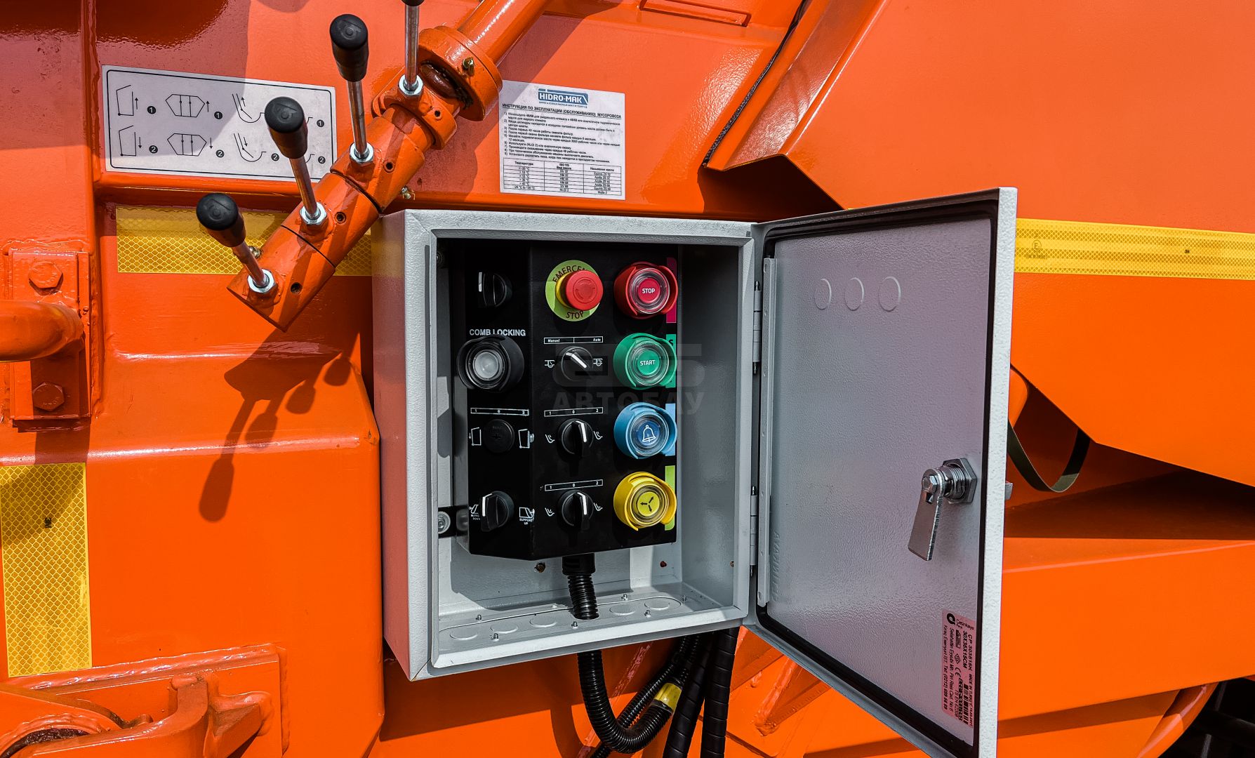 Основной бункер разгружается выталкивающей плитой после поднятия заднего борта. Операция осуществляется при помощи рычагов расположенных за кабиной. В процессе разгрузки применяются кнопка «подгазовки» и кнопка «одиночного цикла», необходимая для разгрузки мусора из загрузочного бункера при поднятом загрузочном бункере.