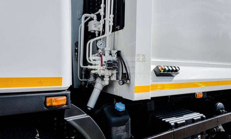 В мусоровозном оборудовании предусмотрена система отвода жидкости, образующейся в процессе прессования. Система состоит из заглубления в передней части надстройки с последующим отводом в бак для сбора жидкости и сливного крана из загрузочного бункера.