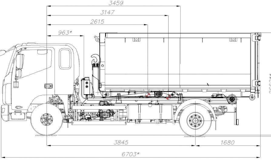 - Фиксаторы контейнера активируются внутренним гидроцилиндром