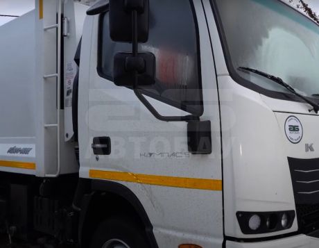 Перед вами автомобиль на шасси КамАЗ Компас, это китайское шасси, которое локализовано для производства России и Камаз освоил производство этих автомобилей, успешно используется в России. Да, это обычный мусоровоз, но у него есть определенные характеристики, которые позволяют экономить на топливе потому что двигатель сделан по самому высокому уровню экологической безопасности, расход которого значительно меньше, чем у других грузовиков.